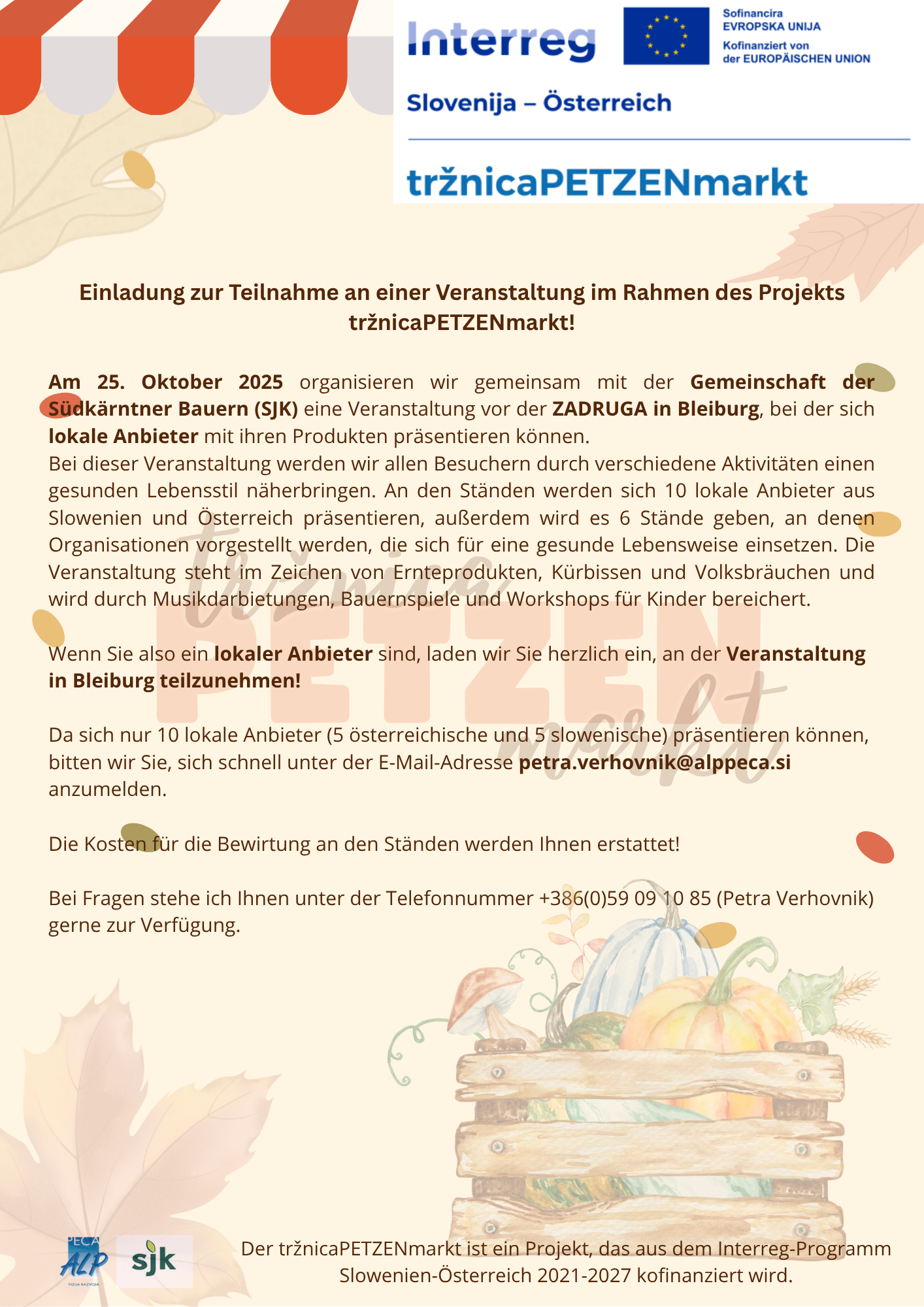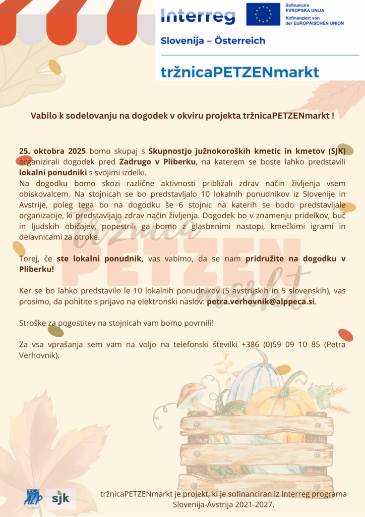 Vabilo k sodelovanju na dogodek v okviru projekta tržnicaPETZENmarkt 25.10.2025 – lokalni ponudniki